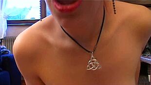 Horny mature Red XXX plays with new dildo, fingering her natural tits in British style