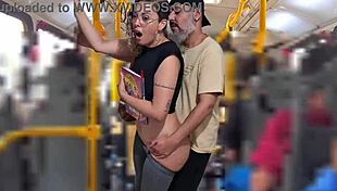 Slutty student licks pussy flashes gets cumshot on public bus ass