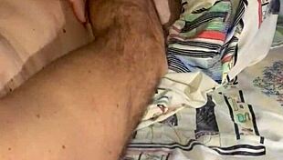 She jerks huge cock to cum explosion swapping loads in bedroom.