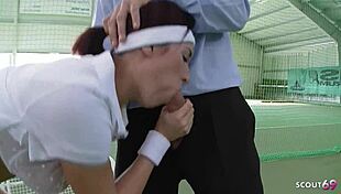 Nympho Tennis Girl Begs for Anal DP and Cumshot on Court
