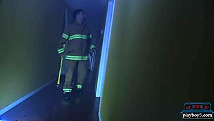 Firefighter subtly fulfills brunette's deepthroat fantasy post-rescue.