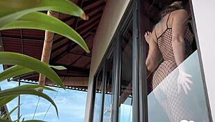 she wakes him with morning standing doggy then kneels for blowjob