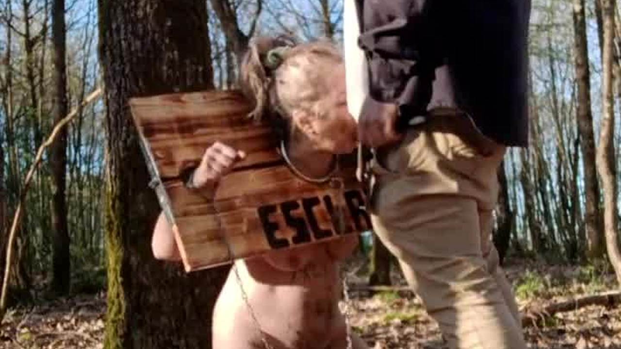 This bound european slave gets cum in mouth after flashing outdoor.