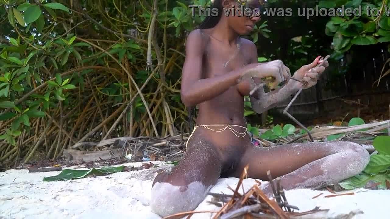 Skinny african girl NAKED cooks medicine for granny in wild forest kitchen scene